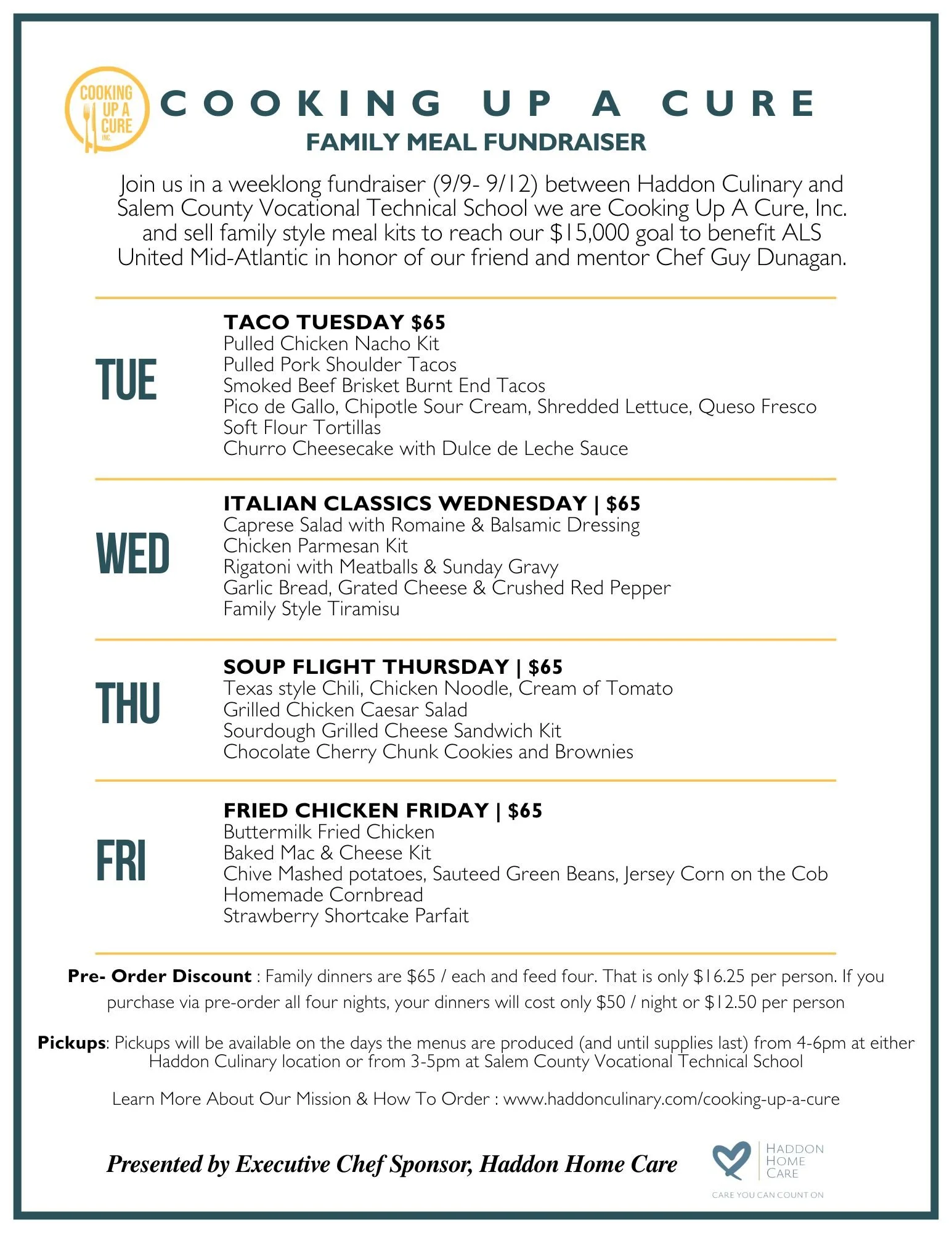 Haddon Culinary and Salem County Vocational Technical School are proud to partner once again to raise funds in honor of our friend and mentor, Chef Guy Dunagan. This year, we’re aiming to raise $15,000 for ALS United Mid-Atlantic through the sale of our popular family meal kits. Last year, over 200 families across South Jersey joined us in support of this meaningful cause and we’re excited to make an even greater impact in 2025.